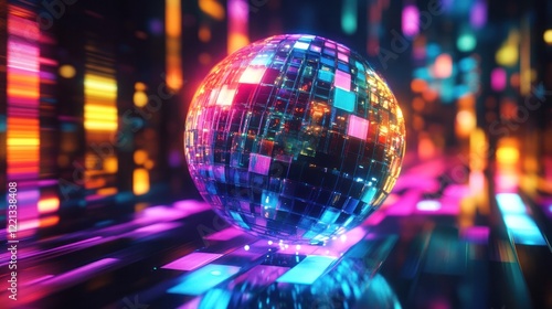Vibrant disco ball glowing and sparkling with mesmerizing lights in a lively nightclub atmosphere Celebrate the festive energetic ambiance with this digital 3D rendering of a captivating party scene