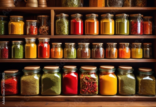 vibrant display colorful spices clear jars elegantly organized rustic wooden shelves creating inviting culinary atmosphere, shelf, arrangement, kitchen