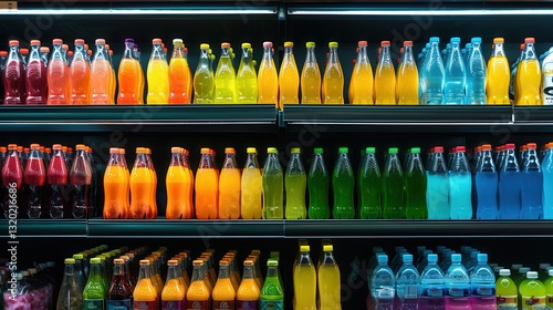 Vibrant Display of Colorful Bottled Beverages in a Store Fridge