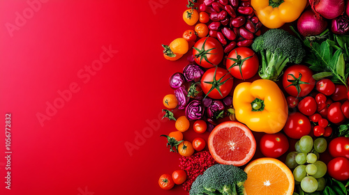 Vibrant display of fresh vegetables and fruits against a bold red background perfect for healthy eating and culinary inspiration