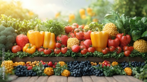 Vibrant display of fresh vegetables and fruits arranged beautifully in a garden setting
