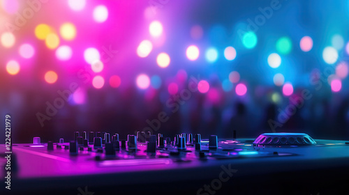 vibrant DJ setup with colorful lights in background creates energetic atmosphere for music lovers