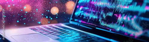 Vibrant Electronic Music Concept with Colorful Sound Waves and Laptop in a Dynamic Atmosphere