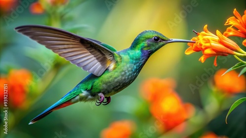 Vibrant emerald hummingbird with iridescent feathers and long, extendable tongue sips nectar from a bright orange flower in a lush, tropical garden setting.