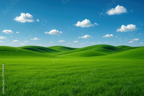 Vibrant emerald meadow carpet stretching endlessly under brilliant azure sky in pristine countryside