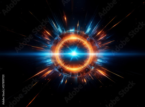 Vibrant energy core bursts with orange and blue light. Radial beams emanate from the center, creating a dynamic cosmic effect on a dark background.