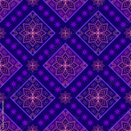 Vibrant Ethnic Geometric Pattern - Seamless Mandala & Star Motif in Royal Purple & Pink for Bohemian Decor, Textile, Packaging, and Digital Backgrounds. Perfect for adding a mystical and ornate touch.
