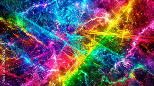 vibrant explosion of intersecting light beams creates mesmerizing display of colors, evoking sense of energy and excitement. abstract design is both dynamic and captivating