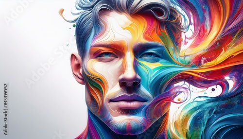 Vibrant face sketch with abstract shapes swirling around, colors blend dreamily.