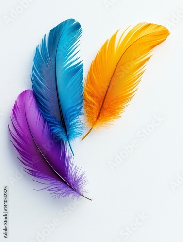 Vibrant Feather Trio Displayed on a White Background Featuring Blue Orange and Purple Hues Artistically