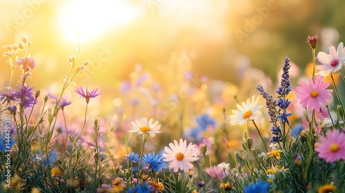 Vibrant Field of Colorful Flowers Under Bright Sunlight Creating a Joyful and Lively Outdoor Scene