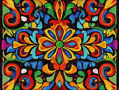 Vibrant Floral Mosaic: A colorful, symmetrical pattern featuring stylized flowers and swirling elements with a stained-glass mosaic effect.
