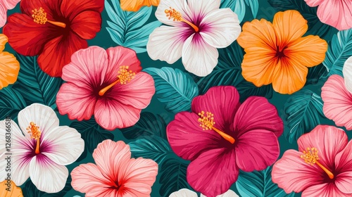 Vibrant Floral Pattern with Colorful Hibiscus Flowers and Lush Green Leaves for Floral Design and Background Use