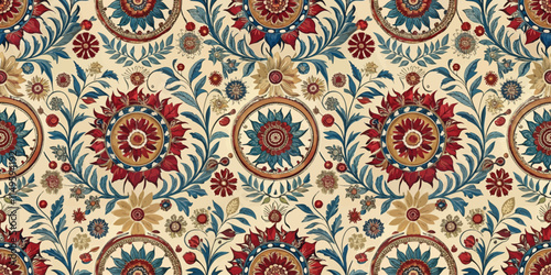 Vibrant floral wallpaper pattern with intricate designs in blue and red tones.