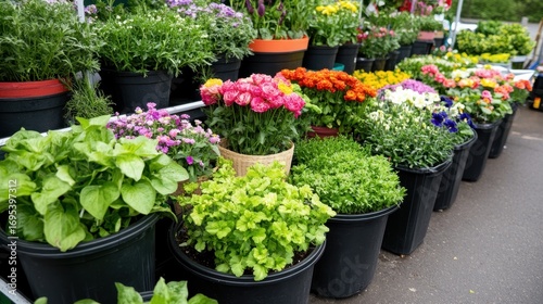 Vibrant Flower and Herb Garden Display at a Local Market Stall