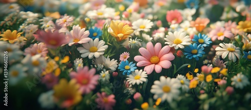 vibrant flower field with colorful daisies and blossoms in soft focus
