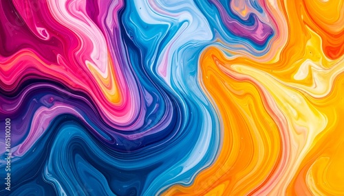 Vibrant fluid marble pattern with swirling strokes of pink, orange, blue, yellow, and white