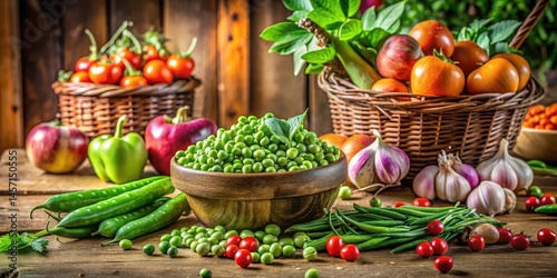 Vibrant fresh garden peas in a colorful mix with other vegetables on a wooden table in a rustic kitchen setting, surrounded by greenery and natural light , garden peas, farm to table