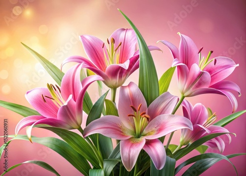 Vibrant fresh spring pink lilies stand tall surrounded by lush green leaves against a soft pastel pink background