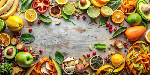 Vibrant Fruits and Vegetables Arranged on a Rustic Wooden Surface, Creating a Colorful and Appealing Culinary Border