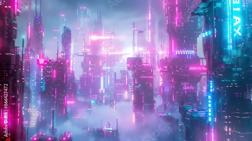 Vibrant futuristic cityscape bathed in neon hues of pink, blue, and purple, featuring towering skyscrapers and glowing digital elements in a dreamlike setting.