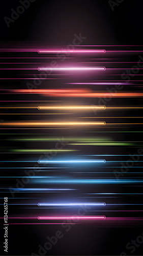 Vibrant, futuristic design featuring colorful glowing neon light horizontal lines against a dark background. Ideal for banners, posters, and modern digital art.