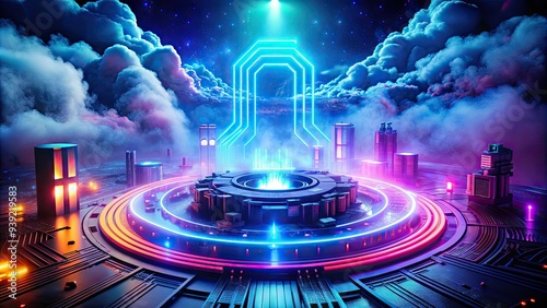 Vibrant, futuristic digital core abstract with glowing circuitry, neon lights, and swirling fog, evoking cutting-edge technology and innovation in a mesmerizing, high-tech environment.