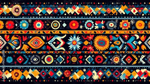 Vibrant geometric background with intricate floral motifs in folk art style background