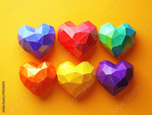 Vibrant geometric hearts in rainbow colors on an orange background symbolize love, diversity, and inclusion. differences in a lively and colorful way, encouraging unity through artistic expression.