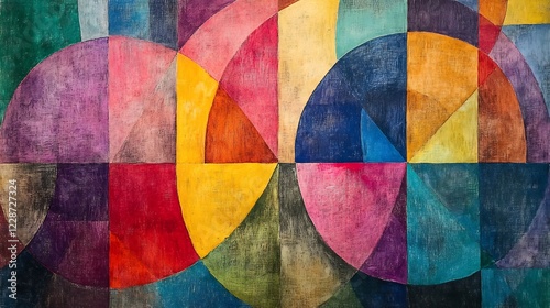 Vibrant geometric painting showcases richly saturated colors subtly blended creating a joyful abstract design. AI Generated