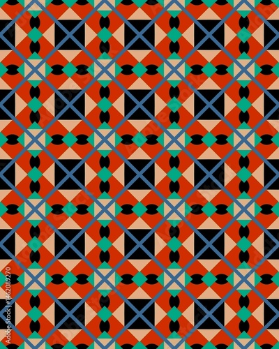 Vibrant geometric shapes create a repeating pattern showcasing bold colors and intricate design ideal for contemporary decor