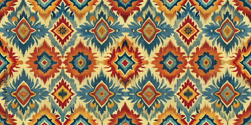 Vibrant geometric textile pattern with bold colors in a repeating design.