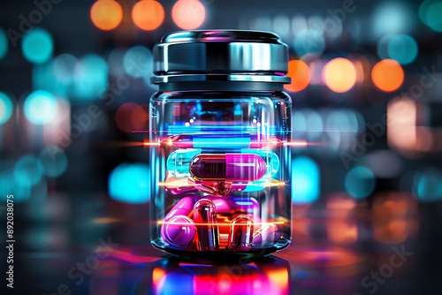 Vibrant glass jar filled with colorful LED lights, creating a mesmerizing bokeh effect in the background, perfect for creative design projects.