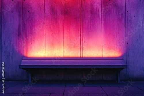 Vibrant glow illuminates a concrete wall and bench in an urban setting during twilight hours. Generative AI