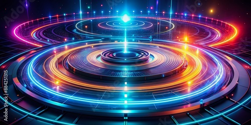 Vibrant glowing circular lines and trails radiate from a futuristic technology turntable, evoking a dynamic, high-tech, and abstract digital concept on a dark background.
