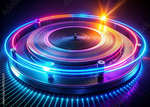 Vibrant glowing lines radiate from a futuristic circular turntable, emitting a mesmerizing digital aura, evoking a sense of high-tech innovation and dynamic energy.