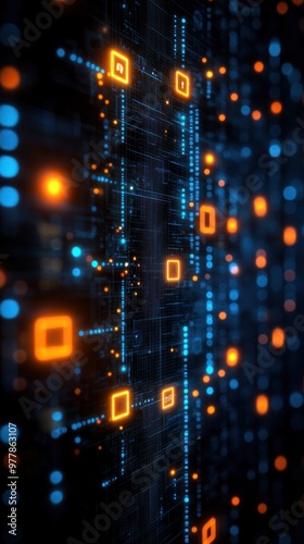Vibrant glowing squares and lines create a futuristic digital landscape with contrasting colors and intricate patterns