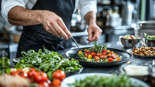 Vibrant Gourmet Salad Preparation: Chef plating a delicious and healthy dish, symbolizing culinary expertise and fresh ingredients. Ideal for restaurant menus, food blogs, cooking websites, and health