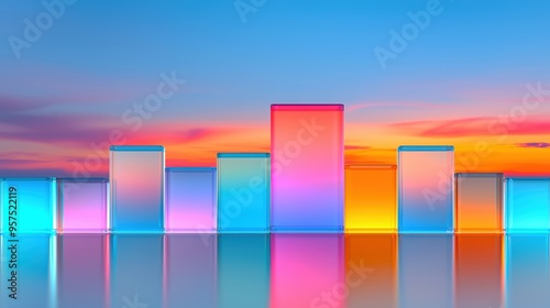 Vibrant gradient columns reflecting on a smooth surface under a colorful sunset sky. Futuristic and abstract design concept.