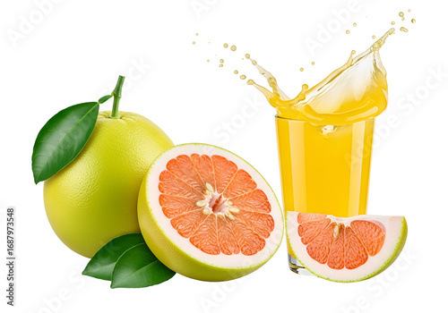 Vibrant grapefruit slices and a glass of juice with a dynamic splash, showcasing the juicy citrus fruit.