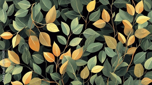 Vibrant Green and Gold Leaves Pattern on Dark Background