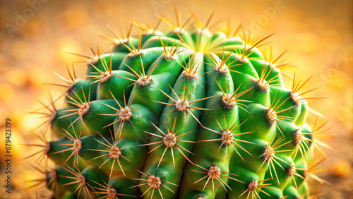 Vibrant green cactus with intricate spines and delicate patterns, set against a warm beige background, evoking a sense of desert tranquility and natural beauty.