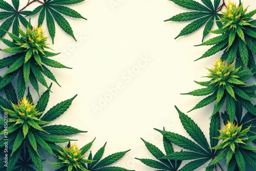 Vibrant Green Cannabis Leaves and Buds Forming a Decorative Frame on a Neutral Background, Perfect for Wellness or Botanical Designs