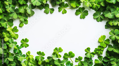 Vibrant green clover leaves framing a white clean background. St. Patrick’s Day. Copy space. Generative AI