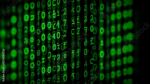 Vibrant green digital code cascades across a dark screen, symbolizing the intricate world of technology and data.