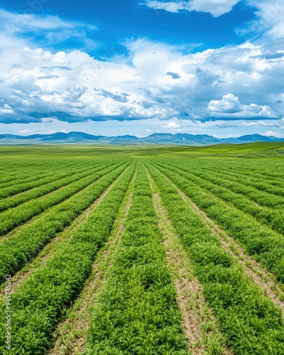 Vibrant green field under a bright blue sky with scattered clouds, showcasing rows of healthy crops and distant mountains.