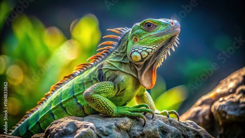 Vibrant Green Iguana Perched on a Rock, Basking in the Sunlight, Displaying its Striking Scales and Crest