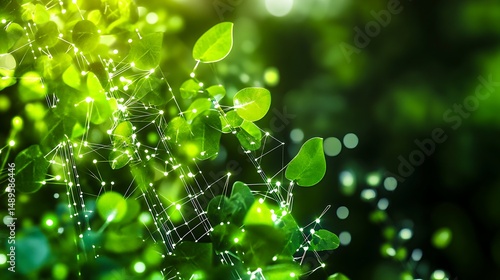 Vibrant Green Leaves Illuminated by Sunlight Nature Photography with Sparkling Dewdrops and Intricate Web