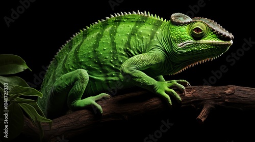 Vibrant green lizard resting on a branch in a dark environment showcasing its detailed scales
