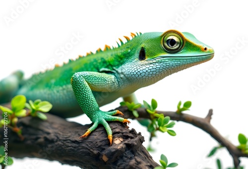 Vibrant Green Lizard Resting on Tree Branch on white Background